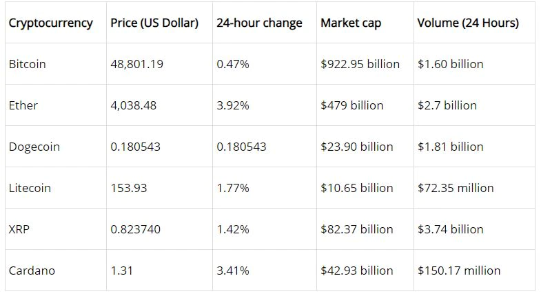At 2:30 pm, Bitcoin, the world’s most popular cryptocurrency, was valued at $ 48,828.10. This is an increase of 0.62% over 24 hours. Bitcoin had a market capitalization of $ 922.81 billion and a 24-hour trade of $ 1.60 billion.