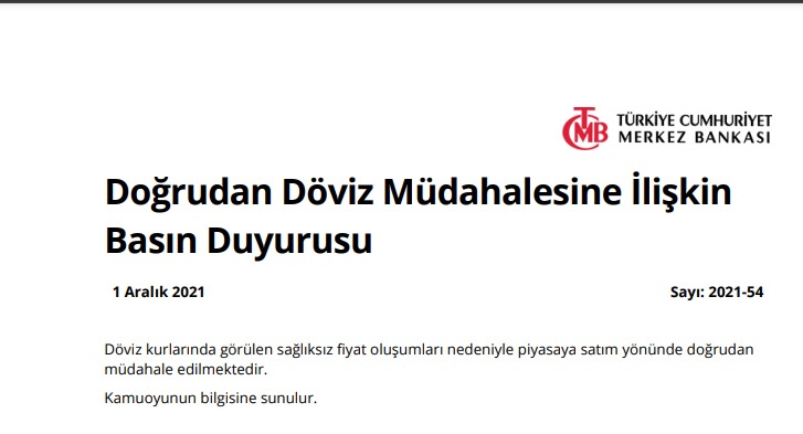 Türkiye Cumhuriyet Merkez Bankası (TCMB) “Döviz kurlarında görülen sağlıksız fiyat oluşumları nedeniyle piyasaya satım yönünde doğrudan müdahale edilmektedir” açıklamasını yaptı.